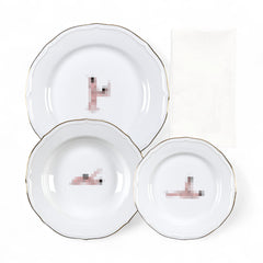PIANO: Cm. 26,5 x 26,5 h.2,2 - PIATTO FONDO: Cm. 22,7 x 22,7 h.3,8 - PIATTO DESSERT Cm. 19 x 19 h. 2 - TOVAGLIOLO Cm. 43x43 - Tovagliolo in puro lino decorato a mano